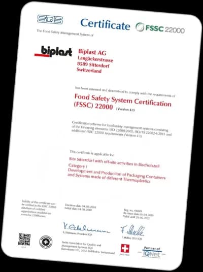 Bei Biplast AG legen wir grossen Wert auf Qualität und Lebensmittelsicherheit. Daher sind wir stolz auf unsere Zertifizierungen nach ISO 9001:2015 und FSSC 22000.
